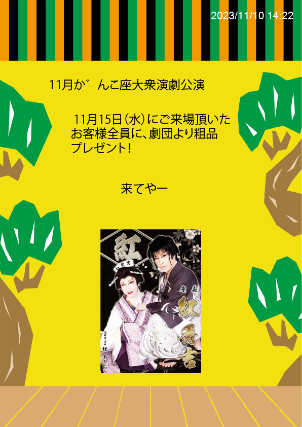 11月公演(紅劇団)平日特典 2023年11月2日 最終更新日時 : 2024年1月30日 ex いつもがんこ座にご来場、応援頂きありがとうございます。 平日特典として、ご来場いただきましたお客様に劇団より粗品をプレゼント! 皆さまのご来場を心よりお待ちしております。 Follow me!