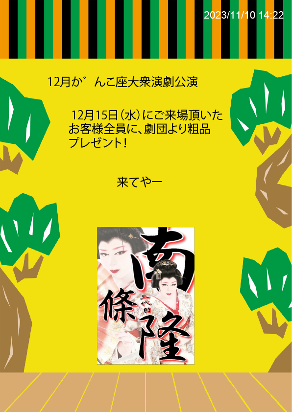 12月公演(南條劇団)平日特典 2023年12月2日 最終更新日時 : 2024年1月30日 ex いつもがんこ座にご来場、応援頂きありがとうございます。 平日特典として、ご来場いただきましたお客様に南條劇団より粗品をプレゼント! 皆さまのご来場を心よりお待ちしております。 Follow me!